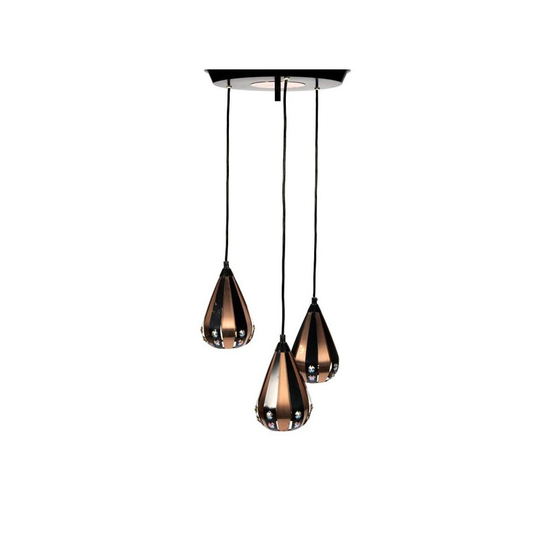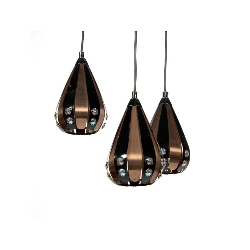 Vintage design hanglamp met 3 kelken ontworpen door Werner Schou in de zestiger jaren voor Coronell electro, Denemarken. De conditie is redelijk goed, een enkele klein plekje oxidatie en krasje, zie de detailfoto's. De afmetingen zijn 70 cm hoog en 30 cm in diameter, een kelk is 19 cm hoog en 11,5 cm in diameter.