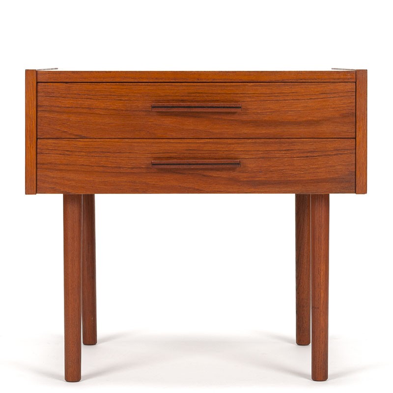 Teakhouten vintage kleine ladekast uit Denemarken, gemerkt aan de onderzijde: made in Denmark. Mooi strak model met 2 lades op slanke pootjes. De conditie is goed, zeer minimale gebruikssporen, zie details. De afmetingen zijn 52 cm breed, 38,5 cm diep en 48,5 cm hoog.