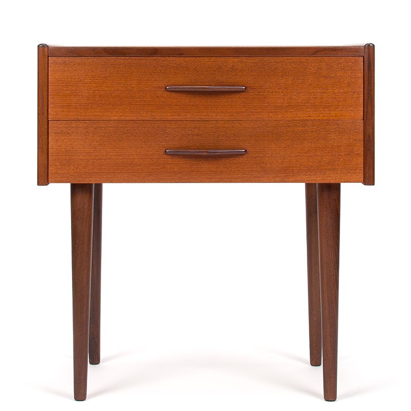 Klein model ladekast uit de midden jaren zestig, Denemarken. Mooi vintage exemplaar met bijzondere vormgeving in het ontwerp. Zie de iets schuin staande pootjes aan de voorzijde. Ook de contrasterende kleur van zowel de handgreepjes als de poten is een mooi detail. De conditie is goed, enkel zeer minimale gebruikssporen, zie details. De afmetingen zijn 61 cm breed, 30 cm diep en 65 cm hoog.