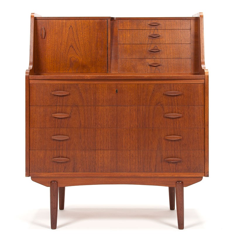 Secretaire meubel uit de midden jaren zestig, Denemarken. Afkomstig uit e Storgaard Nielsen Møbelfabrik te Herning. Bijzondere detail is het linker deurtje waarachter en prachtig vormgegeven spiegeltje geplaatst is. De conditie is goed gezien de leeftijd, enkele lichte gebruikssporen ( aan de linker zijde een paar krasjes) geen waterkringen, zie details. De afmetingen zijn 85,5 cm breed, 46 cm diep en 106 cm hoog.