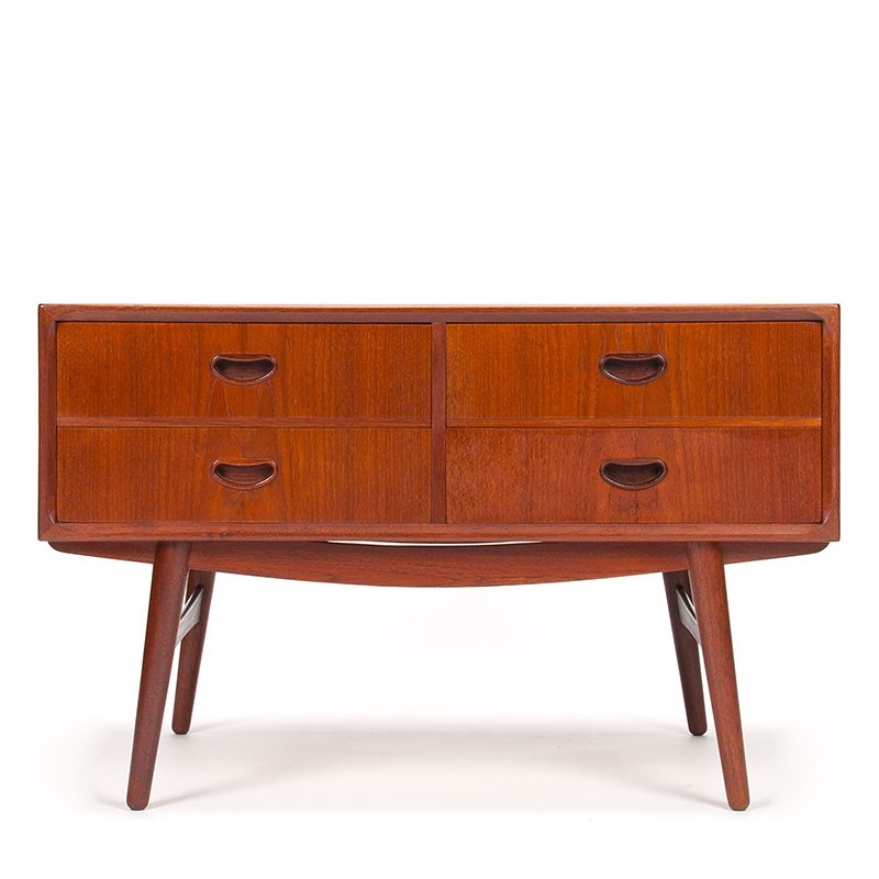 Teakhouten laag model ladekast uit de periode 1960-1969, Denemarken. Mooi vintage kastje met 4 lades. Het geheel staat op een open onderstel met schuine pootjes. De conditie is goed gezien de leeftijd, geen waterkringen of krassen, zie details. De afmetingen zijn 84 cm breed, 49,5 cm diep en 54,5 cm hoog.