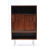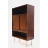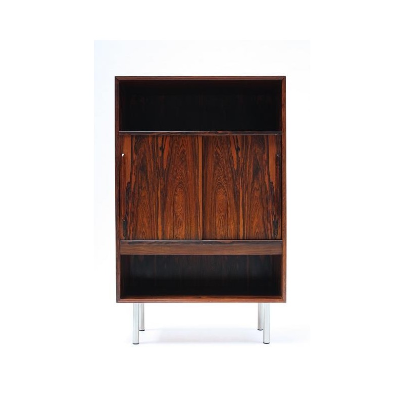 Zeldzaam mooie kast uitgevoerd in palissander hout. De kast heeft een prachtige houtvlam wat de kast een extra luxe uitstraling geeft. De smalle kast heeft 2 schuifdeuren en 2 open ruimtes. De conditie is erg goed. De afmeting is 67 cm L/ 32 cm B/ 122 cm H.
