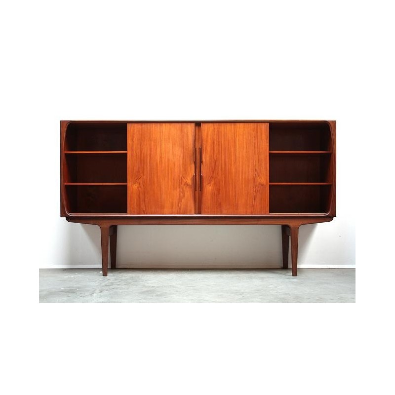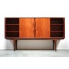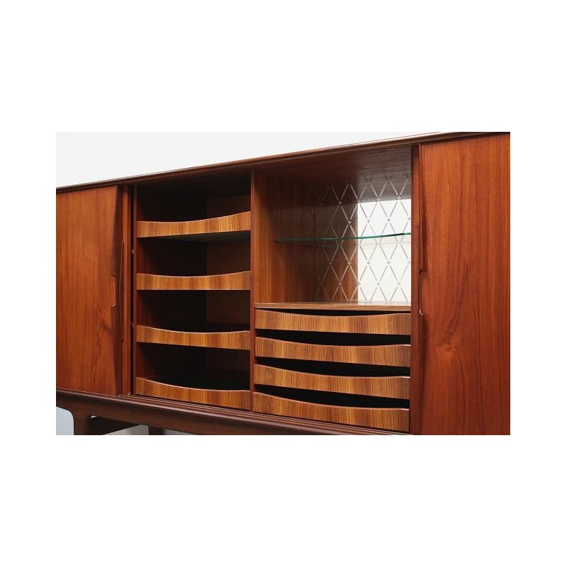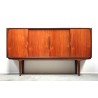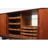 Vintage dressoir gemaakt van teakhout. Het dressoir heeft een aantal prachtige details waaronder de handgrepen en rond lopende hoeken. Er is veel opbergruimte en een bar gedeelte met spiegel. De kast verkeert in een goede staat gezien zijn leeftijd (zie detailfoto's).