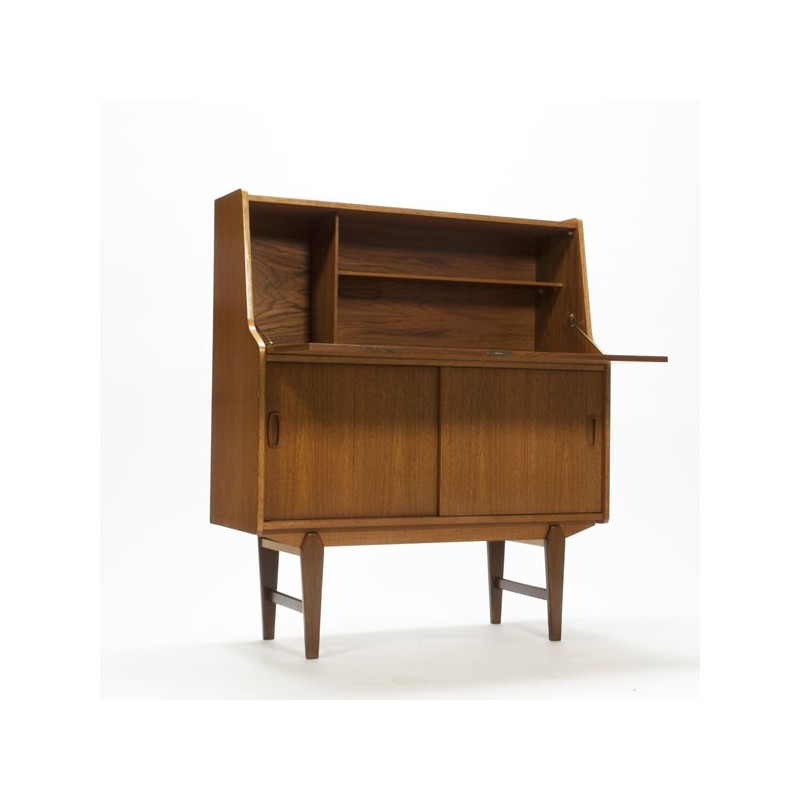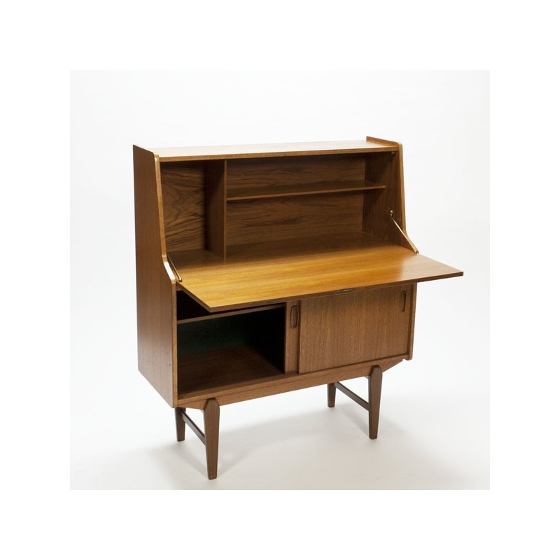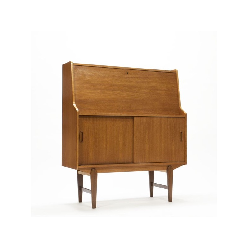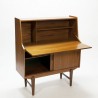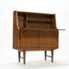 Vintage secretaire ontworpen omstreeks 1960, uitgevoerd in teakhout. De secretaire heeft schuifdeurtjes aan de onderzijde, met daarboven daarboven een uitklapbaar werkblad.