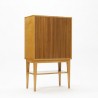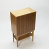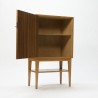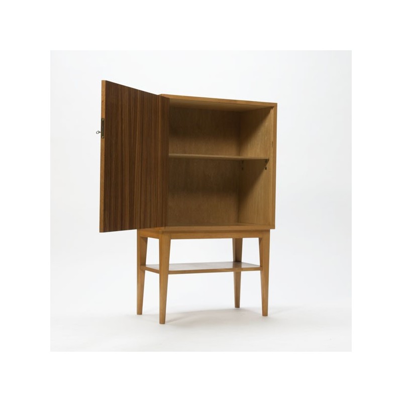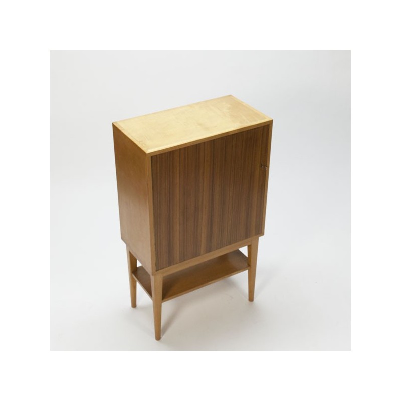 Mooie kast uitgevoerd in berkenhout met een teakhouten deur. Het ontwerp en afwerking van de kast doet vermoeden dat deze ontworpen is door Cees Braakman voor Pastoe, maar dit kunnen wij niet onderbouwen. De kast staat op een mooi hoog onderstel en verkeert in een goede staat gezien de leeftijd, zie ook de detailfoto's. De afmeting is 65 cm L/ 35 cm B/ 110,5 cm H.