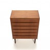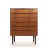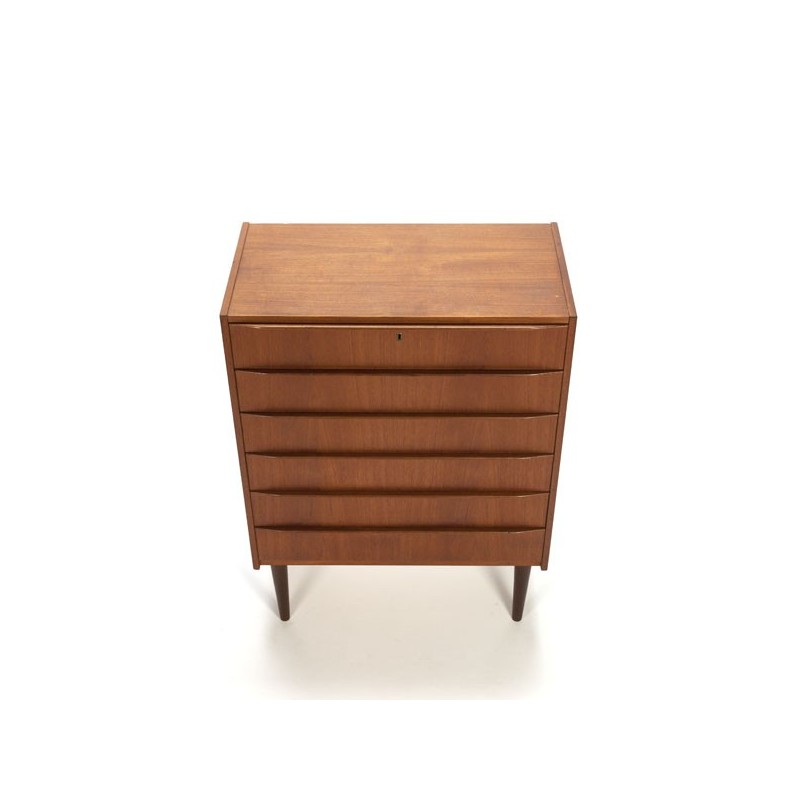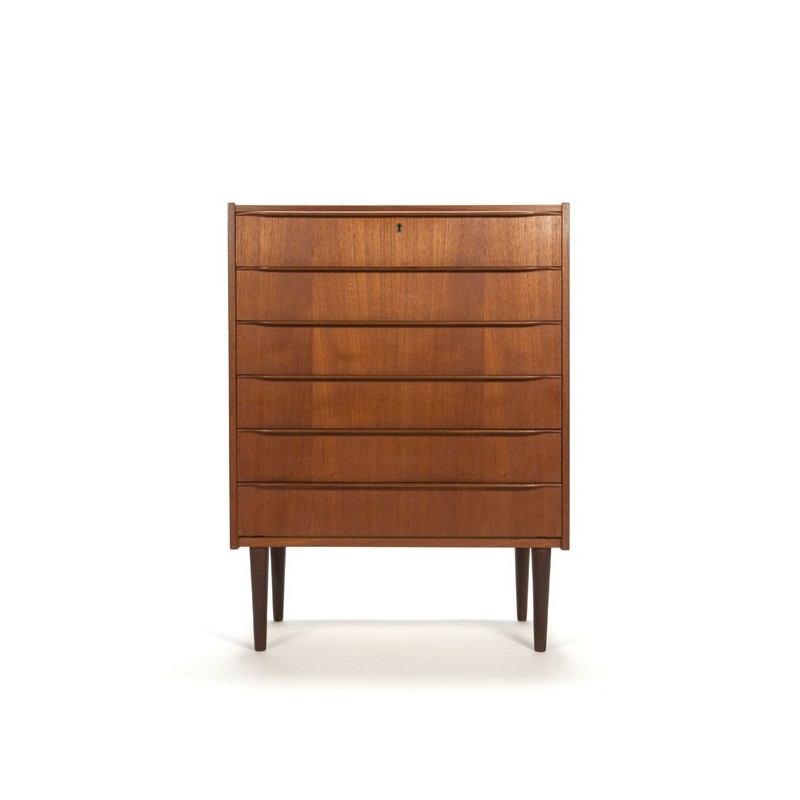 Vintage design ladekast ontworpen in de midden jaren zestig in Denemarken. De kast heeft 6 ruime lades en een mooie doorlopende houttekening aan de voorzijde. De conditie is goed gezien de leeftijd, er zijn enkele lichte gebruikssporen zichtbaar, zie ook de detialfoto's. De afmeting is 76 cm L/ 41 cm B/ 101 cm H.