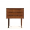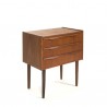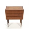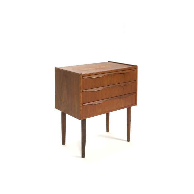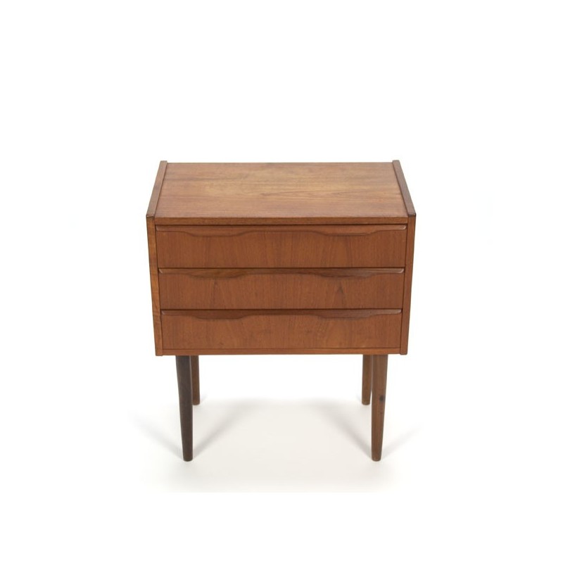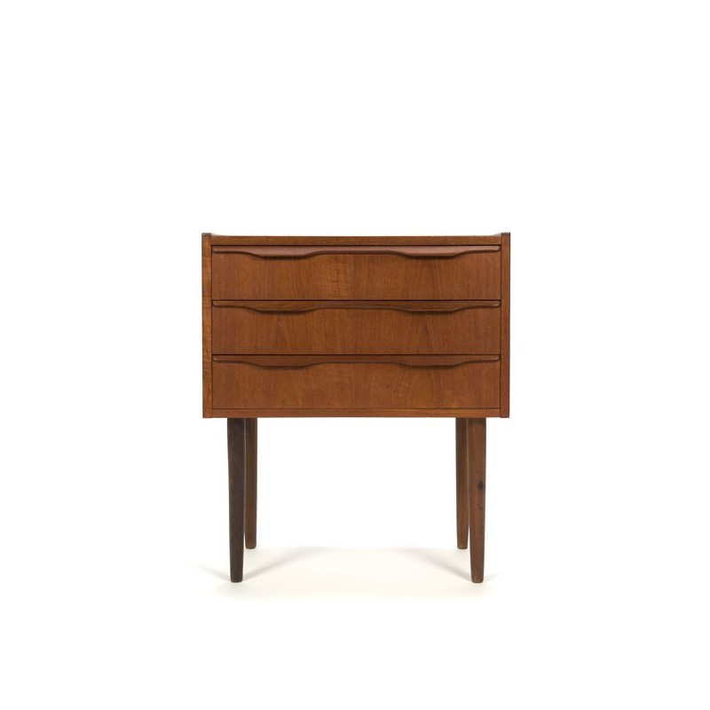 Vintage Deens design ladekastje, uitgevoerd in teakhout. Het kastje is een klein model en heeft 3 lades, de handgreepjes zijn mooi organisch vormgegeven. De conditie is goed gezien de leeftijd, zie ook de detailfoto's. De afmeting is 53,5 cm L/ 31 cm D/ 62,5 cm H.