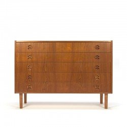 Deense teakhouten vintage ladekast uit de zestiger jaren. De ladekast heeft een ronde organisch gevormde greep en een houtvlam die mooi doorloopt in de 5 lades. De conditie is goed gezien de leeftijd, zie de details. De afmetingen zijn 110 cm breed, 40 cm diep en 78 cm hoog.