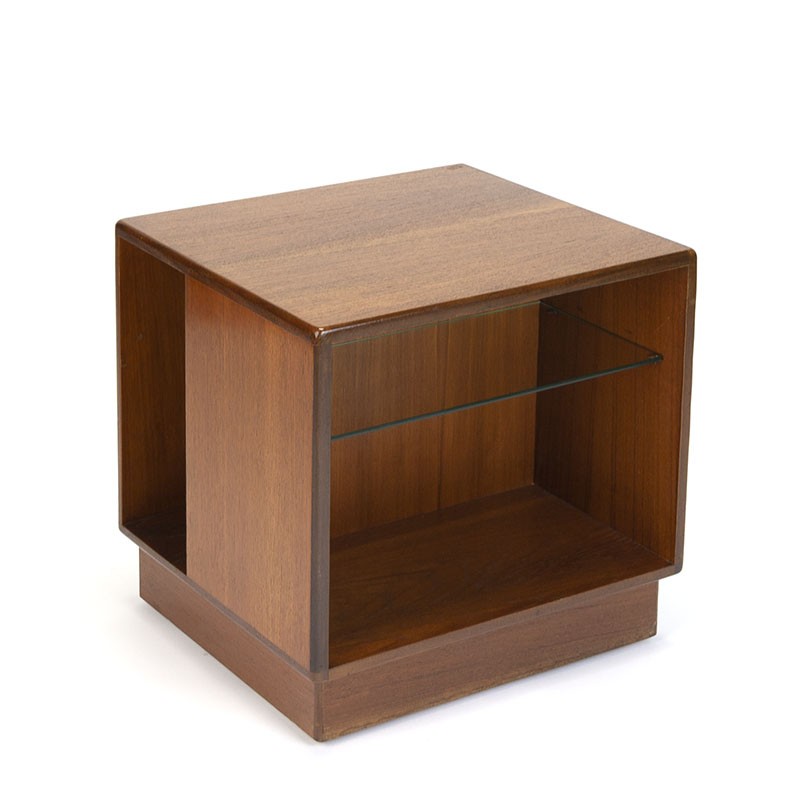 Teakhouten bijzettafel en/ of kastje uit de zestiger jaren. Het kastje staat op wieltjes en heeft 2 open vakken waarvan een met glasplaat. Het meubeltje is gemerkt. De conditie is goed, minimale gebruikssporen, zie details. De afmetingen zijn 52 cm breed, 45,5 cm diep en 55 cm hoog.
