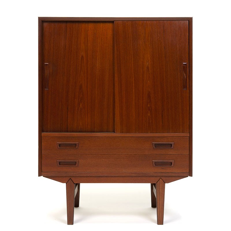 Deense kast, smal model, uit de midden jaren zestig. Vintage exemplaar met 2 schuifdeuren boven en onder 2 ruime lades. Mooi afgewerkt met oog voor detail. De conditie is goed, enkel minimale gebruikssporen, zie details. De afmetingen zijn 87 cm breed, 42 cm diep en 118 cm hoog.
