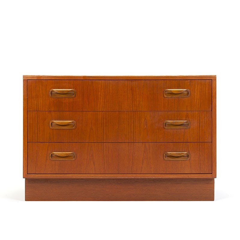 Laag model ladekast uit de zestiger jaren. De vintage ladekast is van het merk Gplan en uitgevoerd in teakhout. De bovenste lade is verdeel in 2 compartimenten. De conditie is goed gezien de leeftijd, zie details. De afmetingen zijn 81 cm lang, 46 cm diep en 53,5 cm hoog.