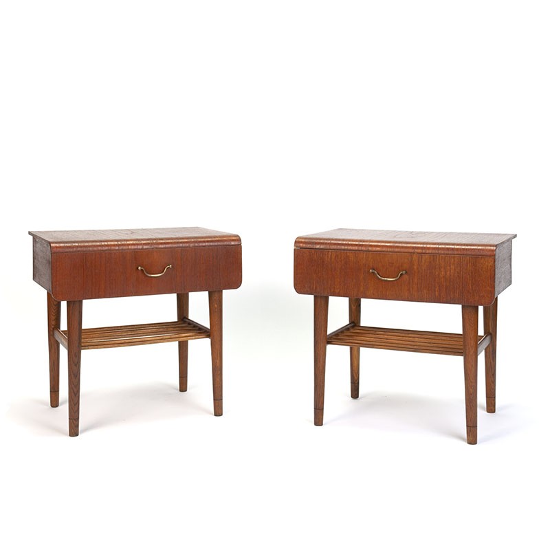 Set van 2 teakhouten nachtkastjes uit de eind vijftiger/ begin zestiger jaren. Bijzondere vintage set afkomstig uit Denemarken. De kastjes zijn vormgegeven met een gebogen teakhouten voorzijde en hebben een messing greepje. Het frame is eiken. De conditie is goed gezien de leeftijd, enkel minimale gebruikssporen, zie details. De afmetingen zijn 48,5 cm breed, 34 cm diep en 50 cm hoog.