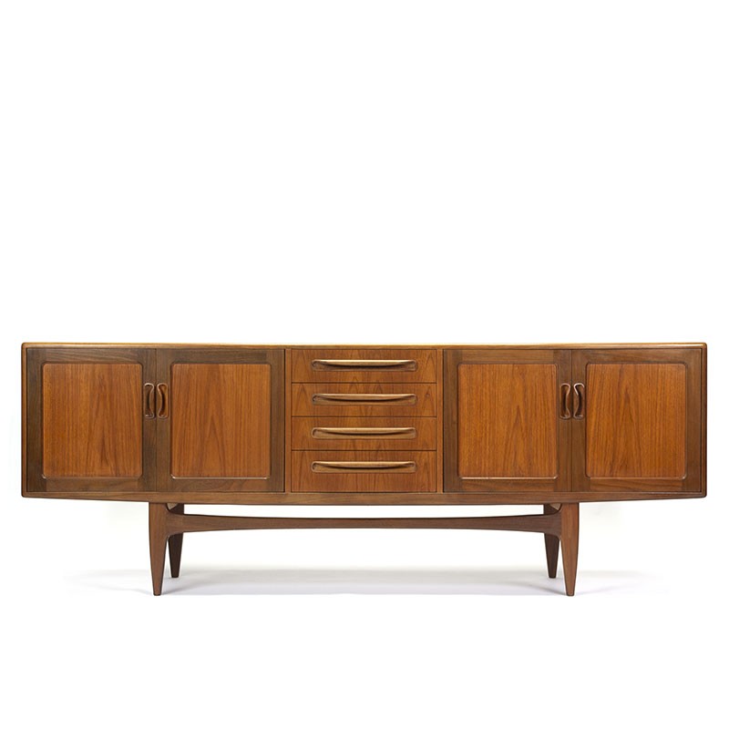 Teakhouten design dressoir uit de jaren zestig. Het vintage dressoir is ontworpen als onderdeel van de Fresco serie door Victor Wilkins voor de Engelse meubelfabriek Gplan. Mooi symmetrisch vormgegeven met in het midden een ladeblok en aan weerszijden openslaande deurtjes, op een mooi open onderstel. De conditie is goed, enkel minimale gebruikssporen, zie details. De afmetingen zijn 213,5 cm lang, 45,5 cm diep en 79,5 cm hoog.
