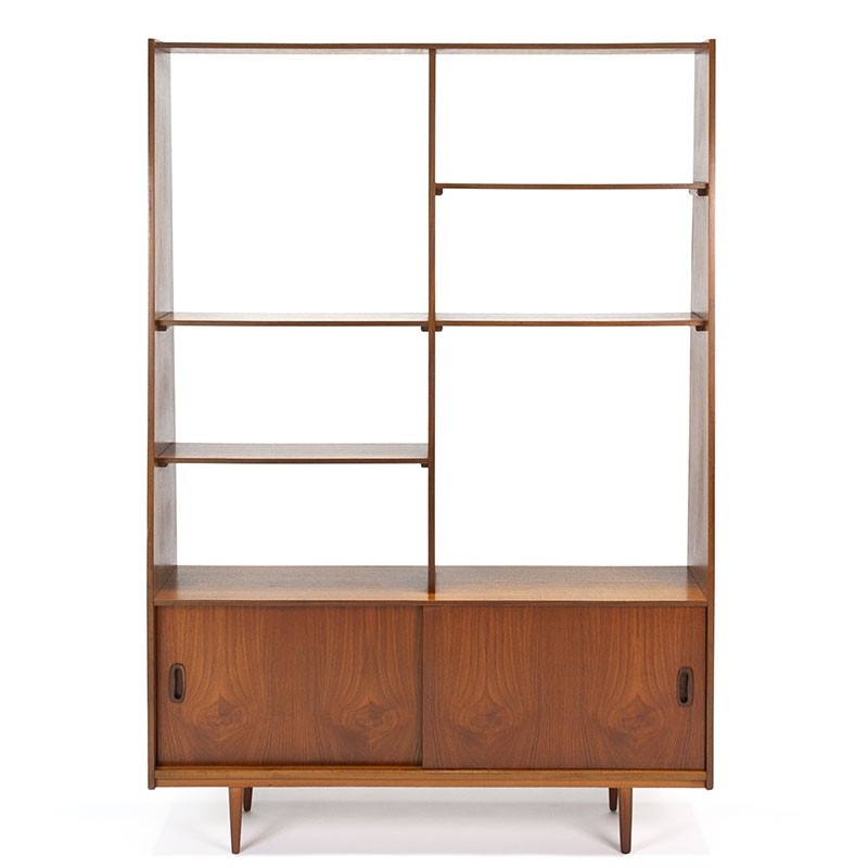 Vintage room divider of boekenkast uit de zestiger jaren. Mooi open model met vakken in verschillende maten in het bovendeel, onder zijn 2 schuifdeuren. De conditie is goed gezien de leeftijd, minimale gebruikssporen, zie details. De afmetingen zijn 119 cm breed, 29,5-19,5 cm breed en 175 cm hoog.