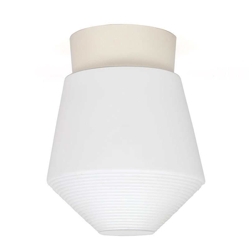 Witte glazen plafondlamp uit de vijftiger jaren. Mooi stijlvol vormgegeven vintage model. De conditie is goed, geen snips van het glas, zie details. De afmetingen zijn 17 cm in diameter en 22,5 cm hoog.