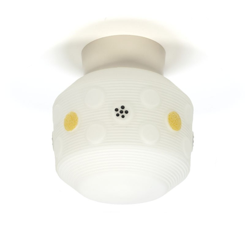 Vintage plafondlamp uit de vijftiger jaren met een glazen bewerkte kelk. Mooi decoratief design. De conditie is goed gezien de leeftijd, zie de details. De afmetingen zijn 19 cm hoog en 16 cm in diameter.