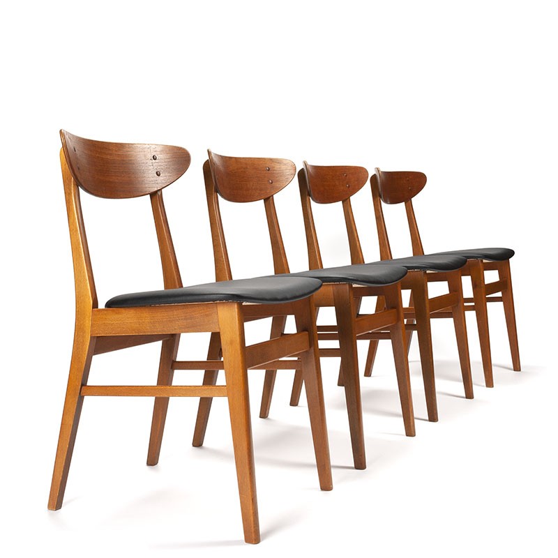 Deense set van 4 originele Farstrup model 210 stoelen uit de jaren zestig. Uitgevoerd met teakhouten rugleuning en beuken frame. De zittingen zijn opnieuw gestoffeerd met zwart kunstleer. De conditie is goed, wel zijn er enkele krasjes zichtbaar op de rugleuning, zie details. De afmetingen zijn 46 cm zithoogte, 46 cm breed en 76,5 cm hoog.