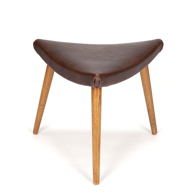 Vintage krukje uit de eind jaren vijftig, begin jaren zestig, Denemarken. Bijzonder model met bruin skakleren bekleding en eiken pootjes. De conditie is goed gezien de leeftijd, skaileer is in goede conditie, zie details. De afmetingen zijn 48,5 cm breed en 38 cm zithoogte.