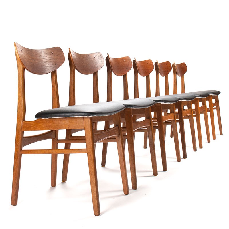 Set van 6 Deense Mid-Century design eettafel stoelen. Mooie set met teakhouten rugleuning en eiken frame. In de rugleuning is de houtverbinding mooi zichtbaar. De bekleding is opnieuw gestoffeerd met zwart kunstleer. De conditie is goed, enkel zeer minimale gebruikssporen, zie details. De afmetingen zijn 47 cm breed, 47,5 cm zithoogte en 77 cm hoog.