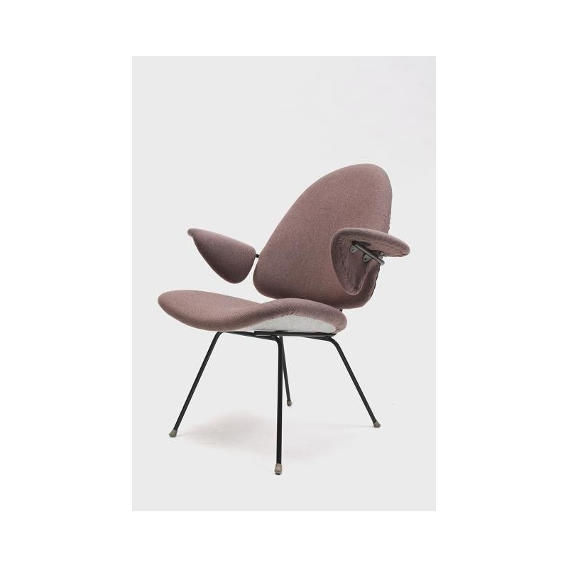 Vintage design fauteuil van het Nederlandse merk Kembo ontworpen in de vijftiger jaren. De stoel heeft een mooie slanke vormgeving en verkeert in een goede staat. De afmeting is 87 cm H/ 40 cm ZH/ 78,5 cm B.