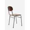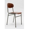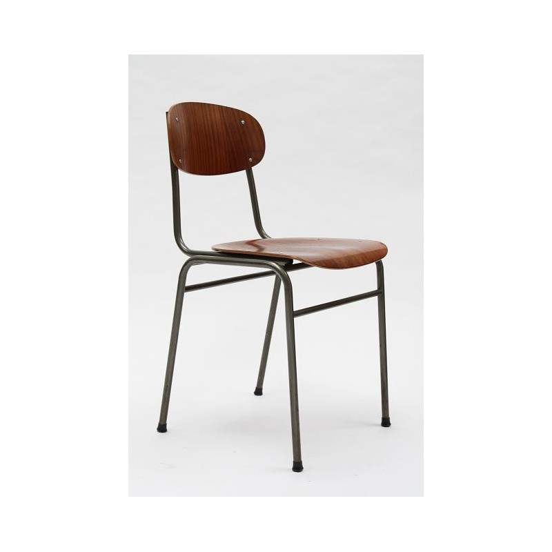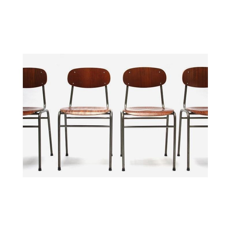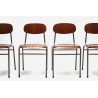 Set van 4 industriele stoelen met metalen frame en houten zitting en rugleuning. De stoelen zijn afkomstig uit Denemarken. De