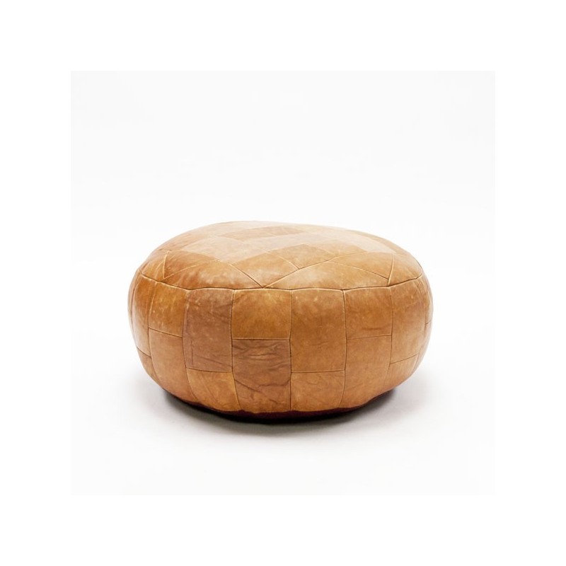Vintage poef in bruin kleurig leer. De poef verkeert in een nette staat gezien zijn leeftijd, zie ook de detailfoto's. De afmeting is 70 cm in diameter en 35 cm hoog.