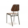 Vintage schoolstoel uit Denemarken met een industriële uitstraling. De conditie is redelijk goed gezien de leeftijd, er zijn lichte gebruikssporen zichtbaar, zie ook de detailfoto's. De afmeting is 40,5 cm B/ 45 cm ZH/ 80 cm H.