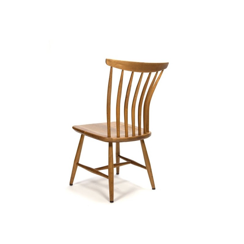 Vintage design stoelen set van 4, ontworpen in 1955 door Bengt Akerblom en Gunnar Eklöf in Zweden. De spijl stoelen zijn uitgevoerd in berken hout en hebben de naam Akerblom chair. De conditie is redelijk goed, hier en daar zijn lichte gebruikssporen zichtbaar, zie ook de detailfoto's. De afmeting is 44 cm B/ 42 cm ZH/ 83,5 cm H.