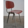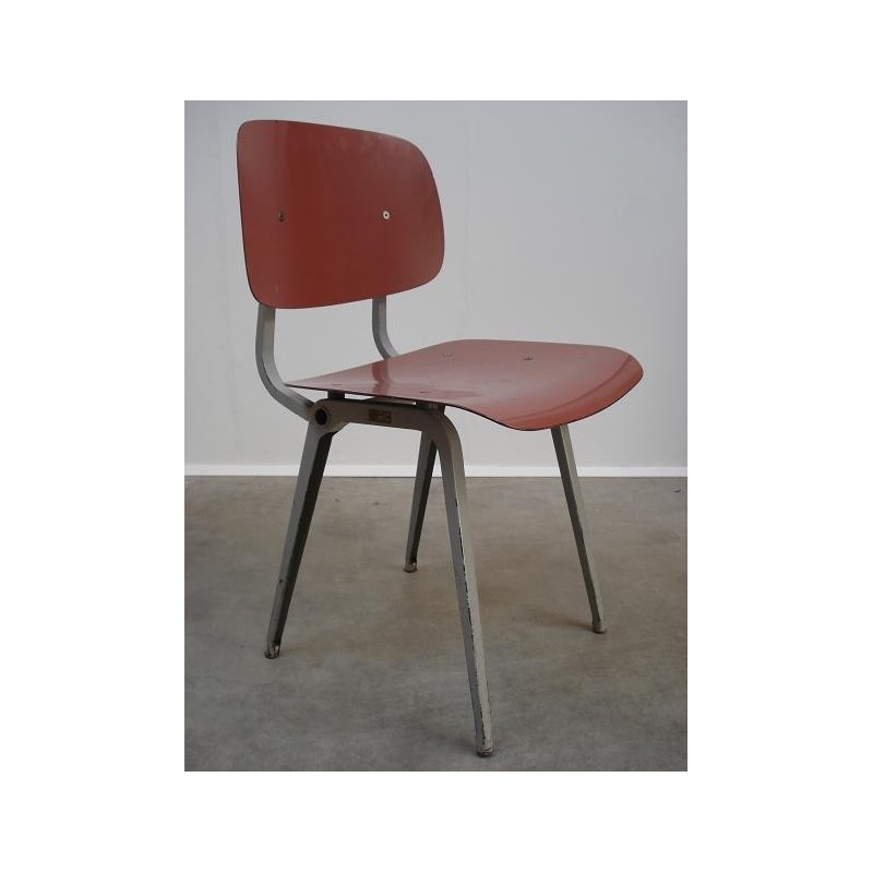 Eerste editie Revolt stoel. Ontworpen door de Nederlandse ontwerper Friso Kramer in 1954 voor Ahrend De Circel. Deze stoel heeft een grijs onderstel en een roze zitting.