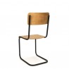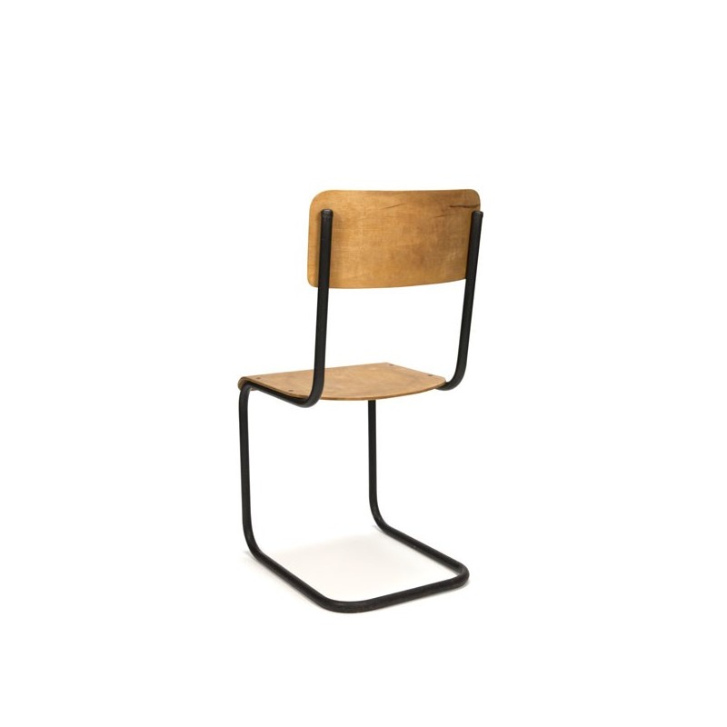 Vintage buisframe stoel uit de zestiger jaren, met zwart metalen frame en blank houten zitting. De conditie is goed gezien de leeftijd, zie ook de detailfoto's. De afmetingen zijn 39 cm B/ 44,5 cm ZH/ 85,5 cm H.