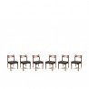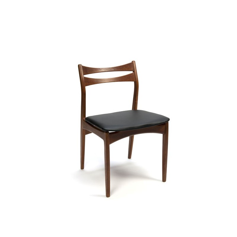 Deense vintage design eettafel stoelen uitgevoerd in teak en gemerkt met het Danish Furniture Makers Control logo. Het ontwerp doet sterk denken aan Erik Buck, maar dit kunnen we niet bevestigen. De stoelen zijn prachtig uitgevoerd in een hoge kwaliteit teakhout en hebben een nieuwe zwarte skai zitting. De conditie is goed, zie ook de detailfoto's. De afmetingen zijn 47,5 cm B/ 45,5 cm ZH/ 74,5 cm H.