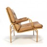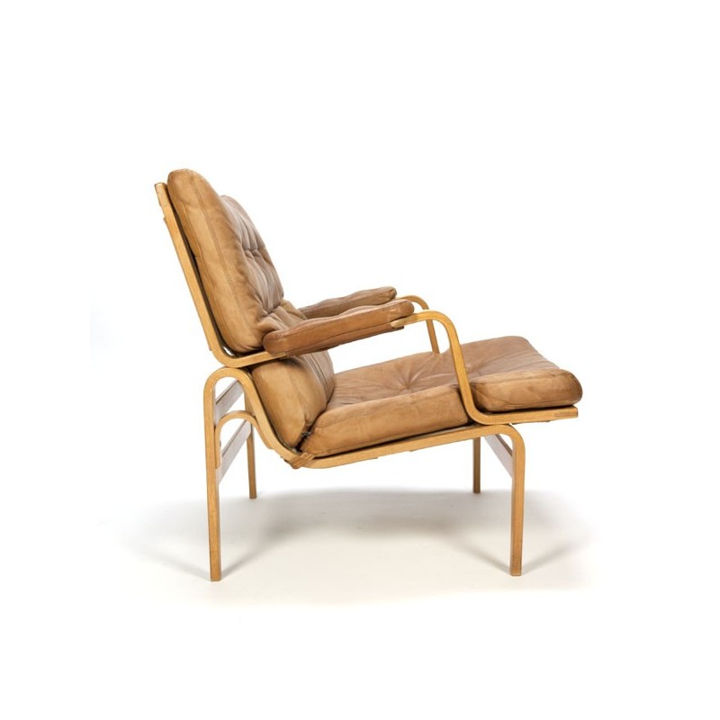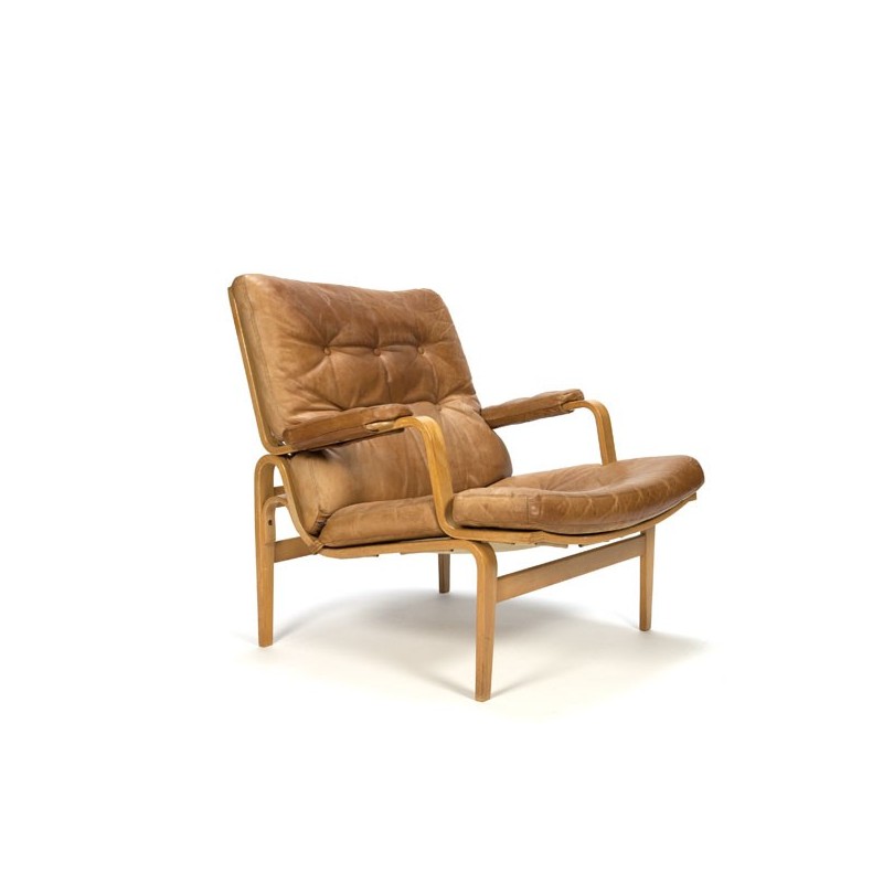 Zweedse design stoel ontworpen in 1969 door Bruno Mathsson en uitgebracht bij DUX, Zweden. De stoel heeft een frame van gebogen berken houten en een cognac-kleurige leren bekleding. De conditie is goed gezien de leeftijd, op de bekleding zijn wat gebruikssporen zichtbaar, zie ook de detailfoto's. De afmetingen zijn 75 cm B/ 37,5 cm ZH/ 78 cm H.
