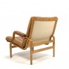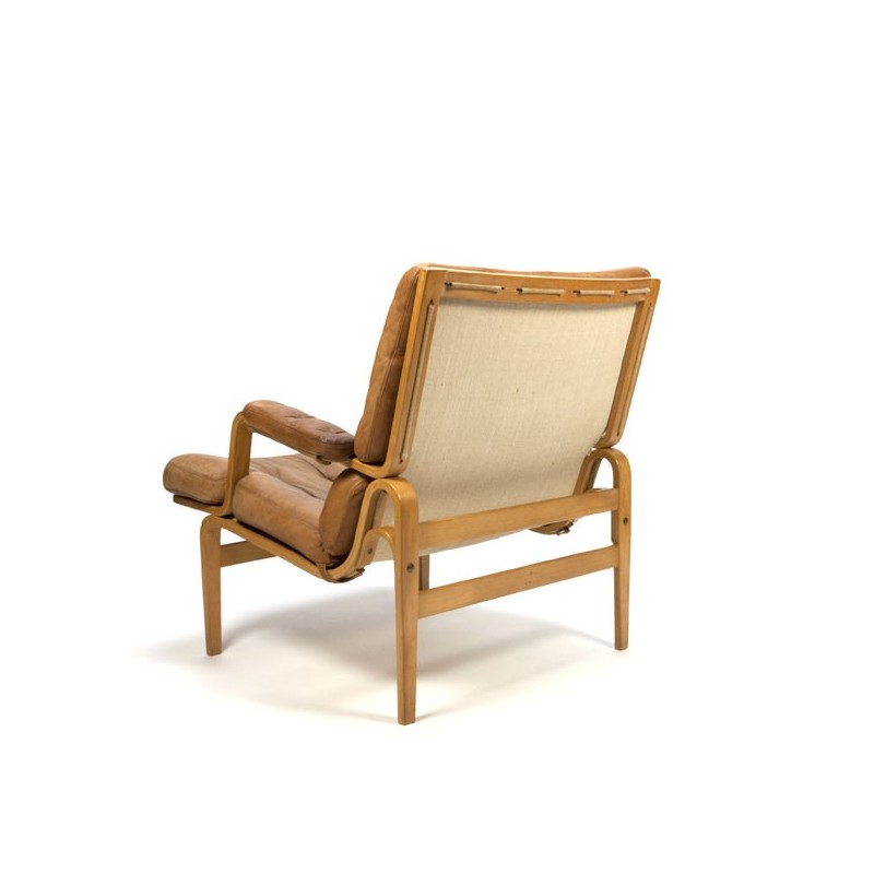 Zweedse design stoel ontworpen door Bruno Mathsson in 1969 en uitgebracht bij DUX, Zweden. Het frame van de stoel is van gebogen berken houten en heeft een cognac-kleurige leren bekleding. De conditie is redelijk goed gezien de leeftijd, op de bekleding zijn wat gebruikssporen zichtbaar, zie ook de detailfoto's. De afmetingen zijn 75 cm B/ 37,5 cm ZH/ 78 cm H.