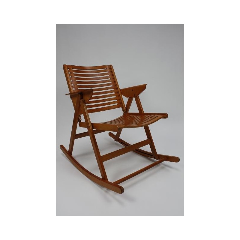 Stoel ontworpen in 1952 door ontwerper Nico Kralj. De stoel, type Rex, is geproduceerd door fabrikant Lowenstein. Bijzonder is dat de schommelstoel opklapbaar is. De conditie is goed. De afmeting is 56,5 cm B/ 77,5 cm H/ 43 cm ZH.