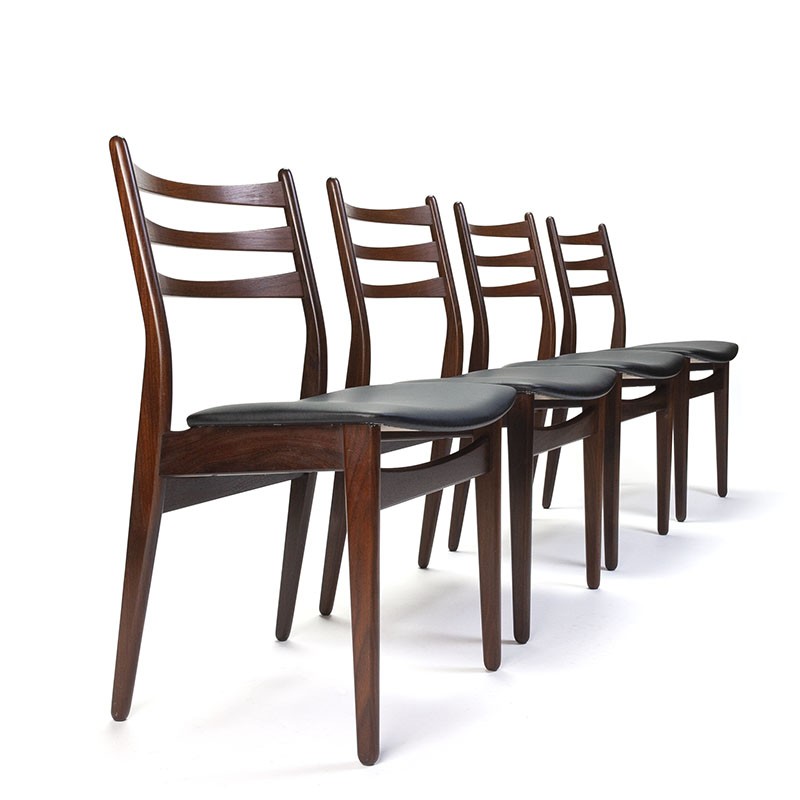 Set eettafel stoelen uit de eind zestiger jaren. De vintage set is gemaakt in de Faldsled Møbelfabrik en uitgevoerd in een donkere tint teakhout. De conditie is goed, minimale gebruikssporen en opnieuw gestoffeerde zittingen, zie details. De afmetingen zijn 50 cmbreed, 45 cm zithoogte en 78 cm hoog.
