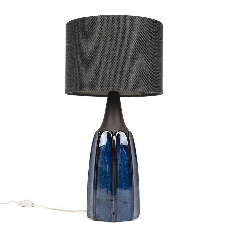 Design tafellamp uit de zestiger jaren, ontworpen door Einar Johansen. De lamp, model nummer 1042, is gemaakt in de Søholm Stentøj fabriek. Prachtige stijlvolle lamp uitgevoerd met deels blauw geglazuurde voet. De conditie is goed, de voet is onbeschadigd, bedrading nagekeken en kap vervangen, zie details. De afmetingen zijn inclusief de kap 59,5 cm hoog, zonder kap 39 cm. De kap is 30 cm in diameter, de voet 16,5 cm.