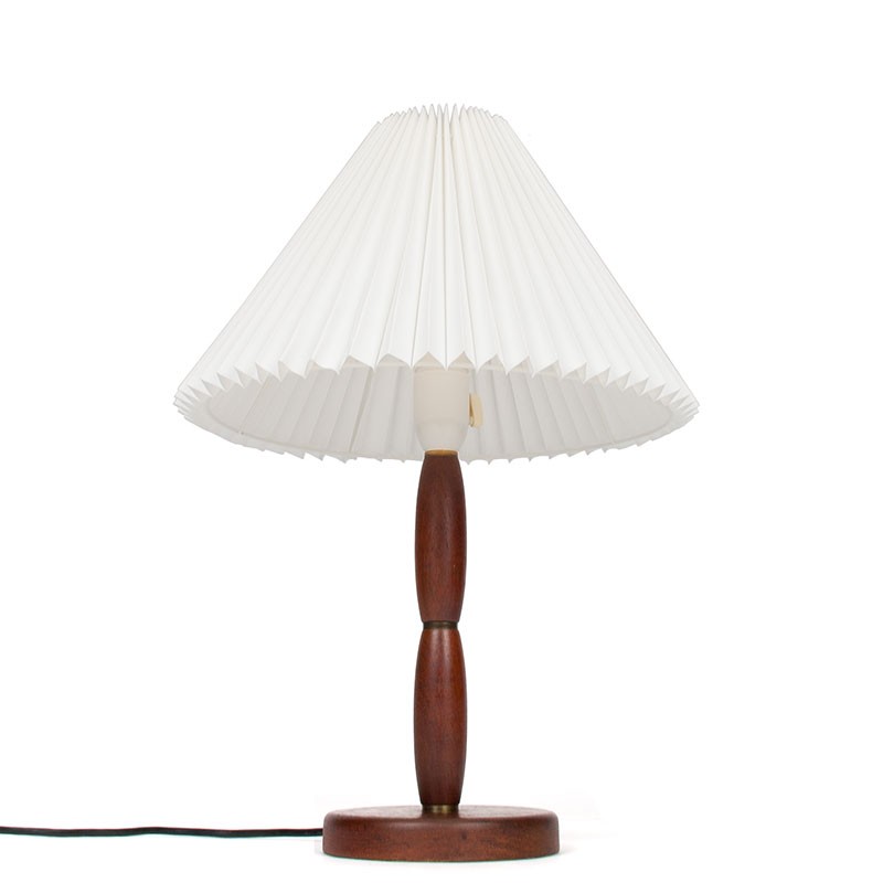Tafellamp afkomstig uit de periode 1960-1969, Denemarken. De vintage lamp heeft een teakhouten voet met klein messing detail. De kap is een model dat op de gloeilamp klemt. De conditie is goed, bedrading is vervangen, zie details. De afmetingen zijn 46 cm hoog en 33 cm in diameter.