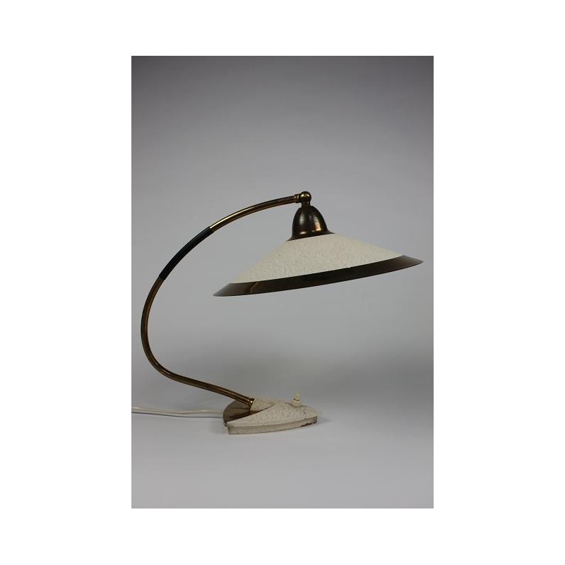 Vintage tafellamp uit de vijftiger jaren. De tafellamp heeft een mooi vormgegeven design en is afgewerkt met messing. De lamp verkeert in een