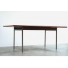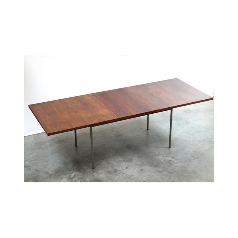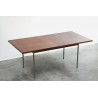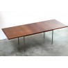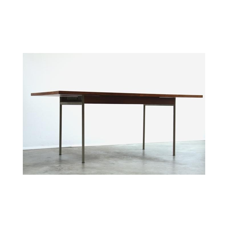 Nederlandse design eettafel ontworpen door Cees Braakman voor Pastoe in de zestiger jaren. De tafel heeft een uitschuifbaar blad en geborsteld metalen poten. De conditie is redelijk goed gezien zijn leeftijd, er zijn lichte gebruikssporen zichtbaar, zie ook de detailfoto's. De afmeting is 180- 233