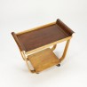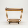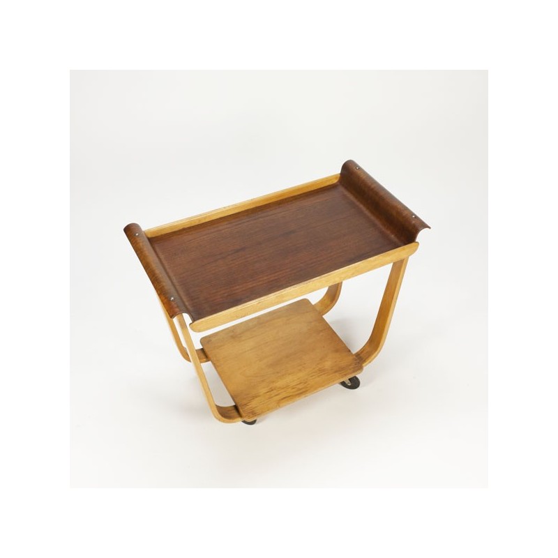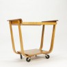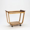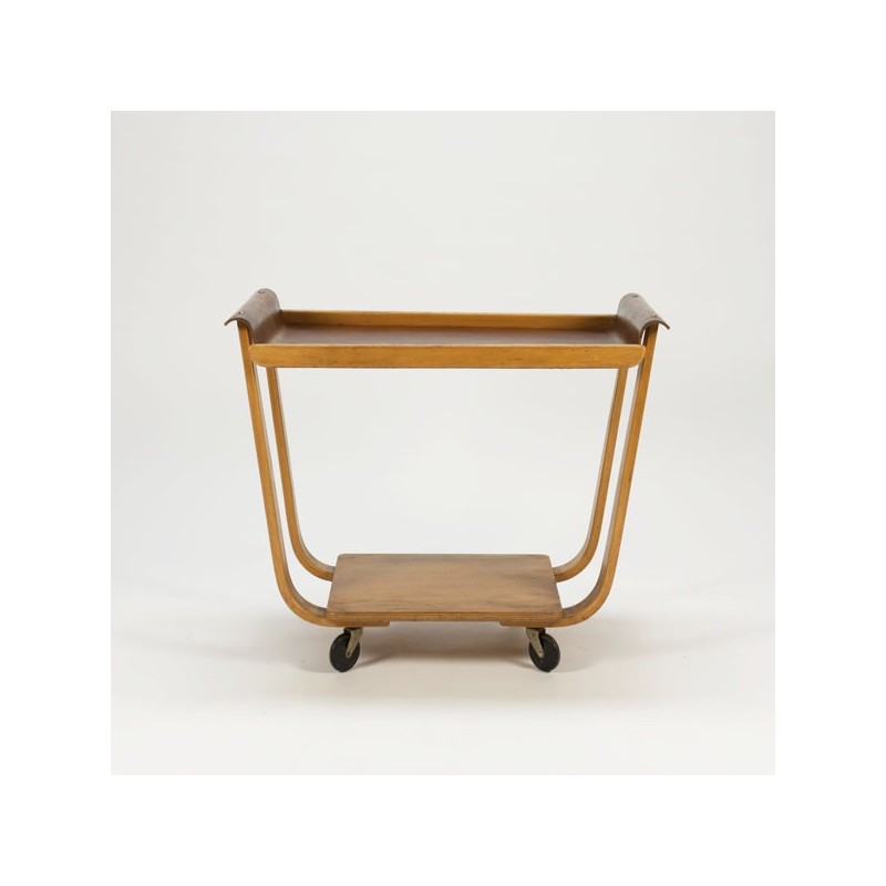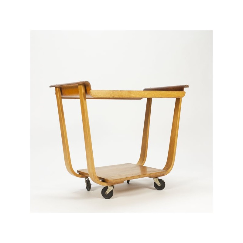 Design serveerwagen ontworpen in de begin jaren 50 door Cees Braakman voor Pastoe. De serveerwagen is uitgevoerd in plywood, met een teakhouten blad. De conditie is zeer goed gezien de leeftijd, zie ook de detailfoto's. De afmeting is 80 cm L/ 45 cm B/ 68,5 cm H.