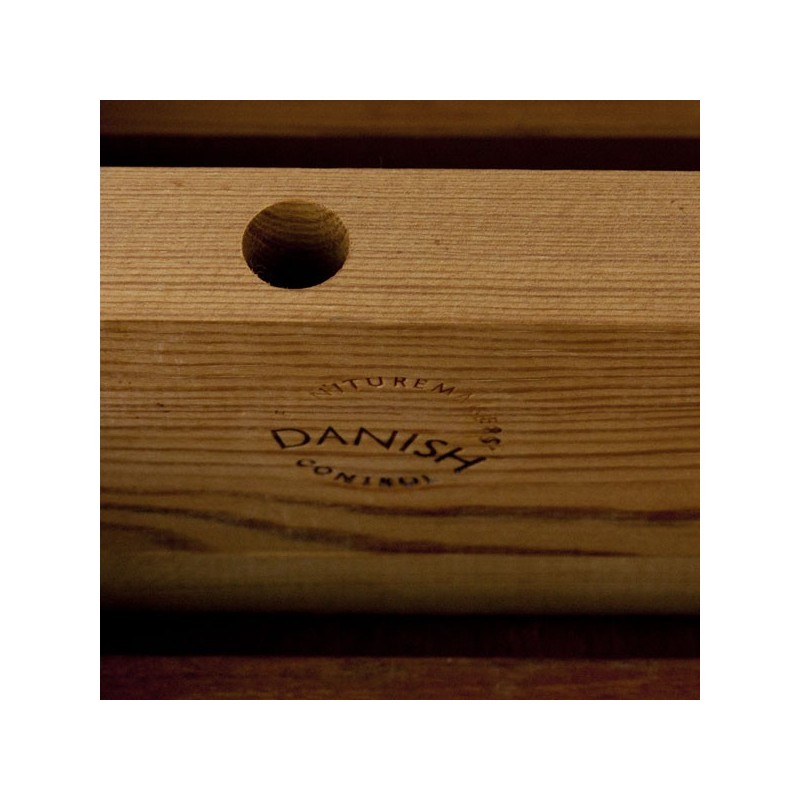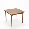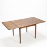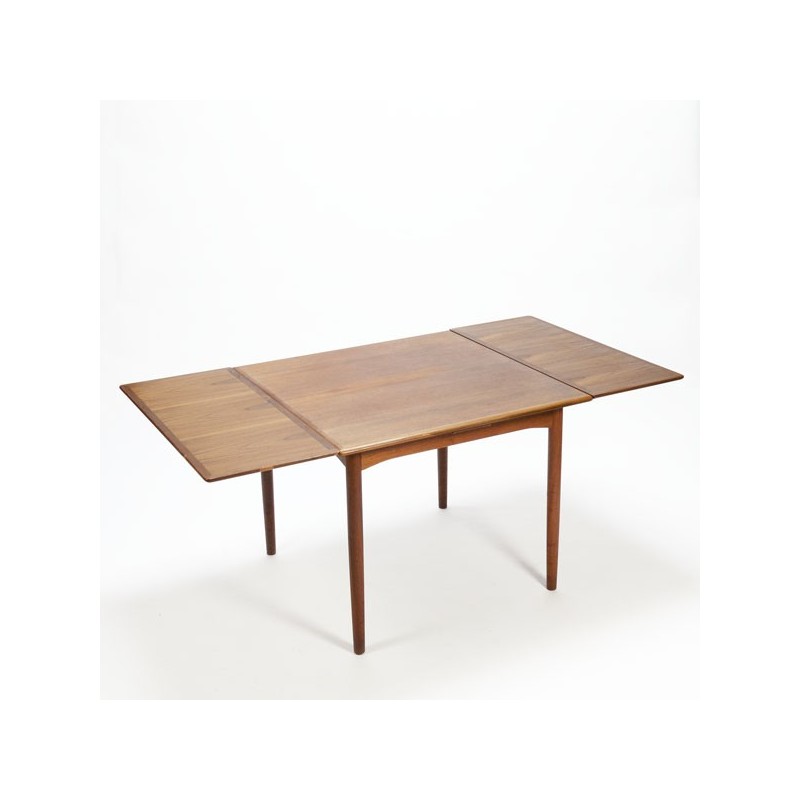 Deense uitschuifbare eettafel uit de vijftiger jaren. De tafel is uitgevoerd in teakhout en is gemerkt met het Danish furniture makers logo. De tafel verkeert in een goede staat gezien de leeftijd, zie ook de detailfoto's. De afmeting is 91 cm ( tot 170 cm) L/ 91 cm B/ 73,5 cm H.