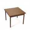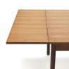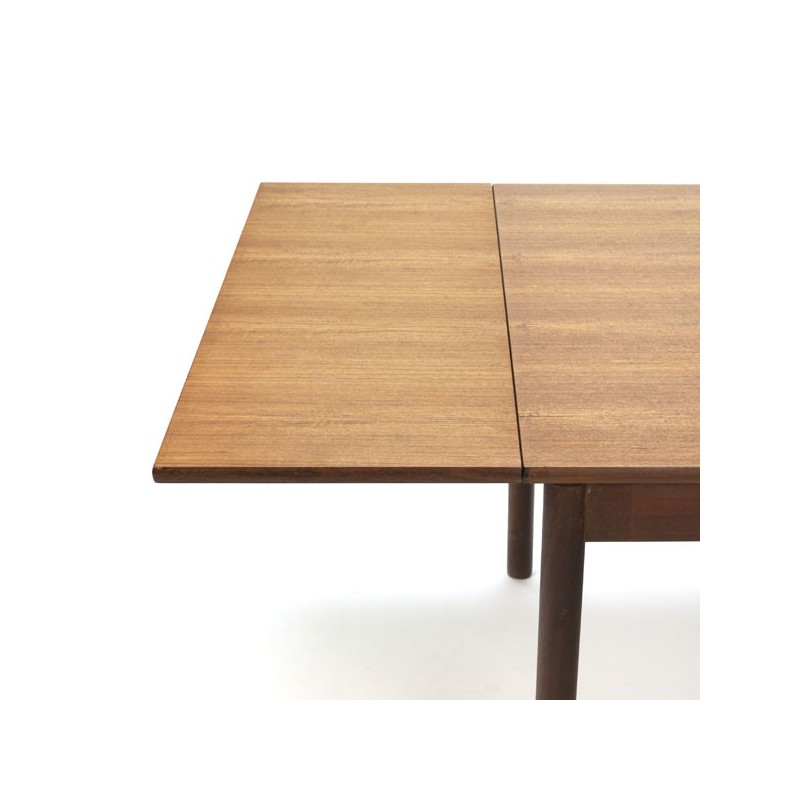 Vintage eettafel uitgevoerd in teakhout uit de zestiger jaren. De tafel is vierkant van vorm en is uitschuifbaar. De conditie is goed, zie ook de detailfoto's. De afmeting is 90 cm L/ 90 cm B/ 72,5 cm H, en te verlengen met 2 maal 37,5 cm waarmee de lengte totaal 165 cm wordt.