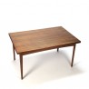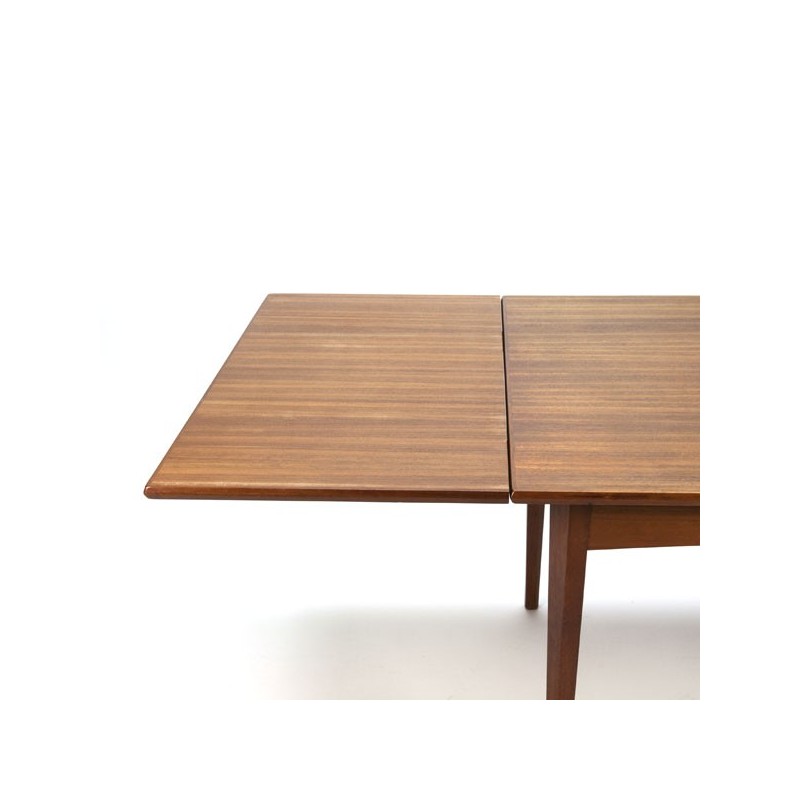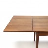 Vintage eettafel uit Denemarken. De tafel is uitgevoerd in teakhout en heeft aan beide korte zijden een uitschuifbaar blad van 50 cm, waarmee de tafel maximaal 240 cm lang wordt. De conditie is vrij goed gezien de leeftijd, er zit op een hoek een kring in het blad, zie ook de detailfoto's. De afmeting is 90 cm B/ 140 cm L-240 cm L/ 73,5 cm H.