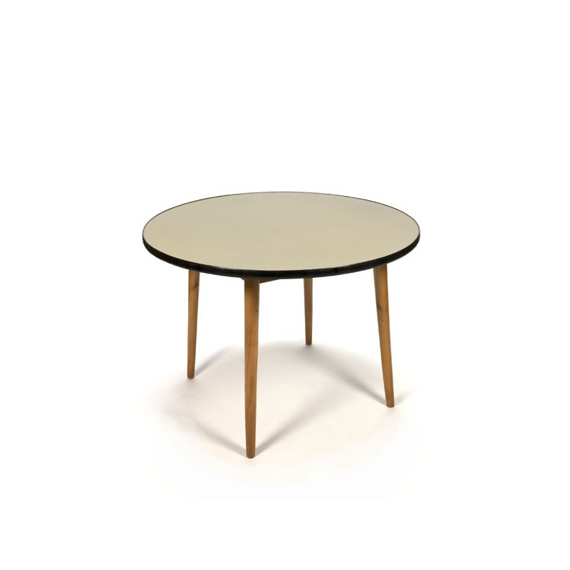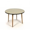 Vintage eettafel uit de vijftiger jaren met geel formica blad. Het onderstel is van blank gelakt hout. De conditie is goed gezien de leeftijd, lichte gebruikssporen zichtbaar, zie ook de detailfoto's. De afmeting is 105 cm in diameter en 74,5 cm hoog.