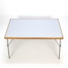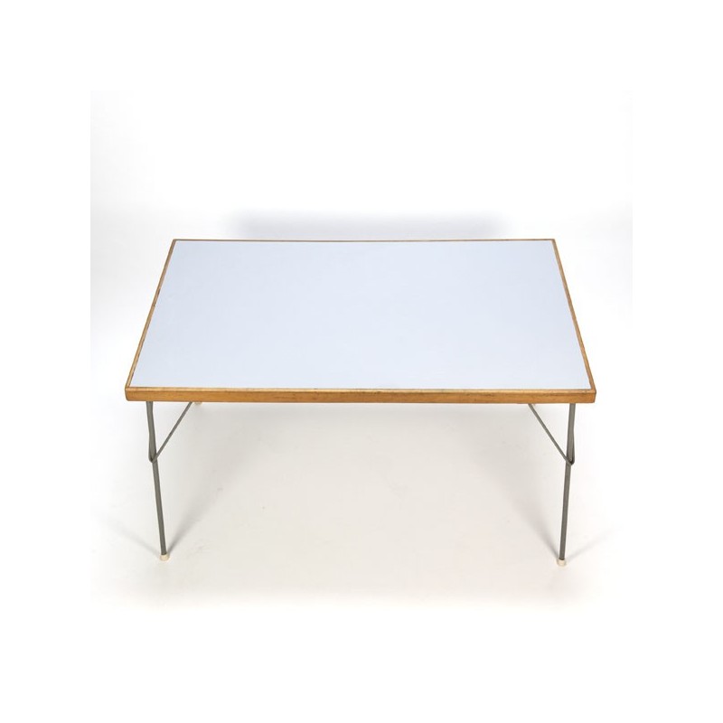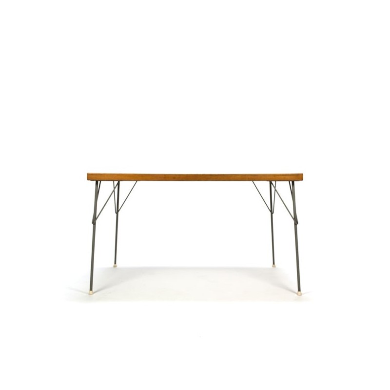 Nederlandse design eettafel ontworpen in 1954 door Wim Rietveld en A. R. Cordemeyer voor Gispen. De tafel, model no.531, heeft een houten blad met bladbedekking van linofelt in een licht grijze kleur. De conditie is redelijk goed gezien de leeftijd, zeker op de poten zijn duidelijk gebruikssporen zichtbaar, zie ook de detailfoto's. De afmeting is 125 cm L/ 75 cm B/ 72,5 cm H.