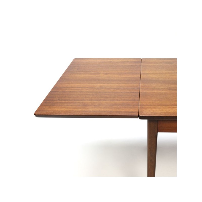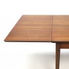 Deense vintage design eettafel uit de midden jaren zestig met uitschuifbare bladen. De tafel is uitgevoerd in een mooie tint teakhout en heeft als speciaal detail koperen voetjes. De conditie is goed gezien de leeftijd, enkel lichte gebruikssporen zichtbaar, zie ook de detailfoto's. De afmetingen zijn 128,5- 230,5 cm L/ 86 cm B/ 74 cm H.