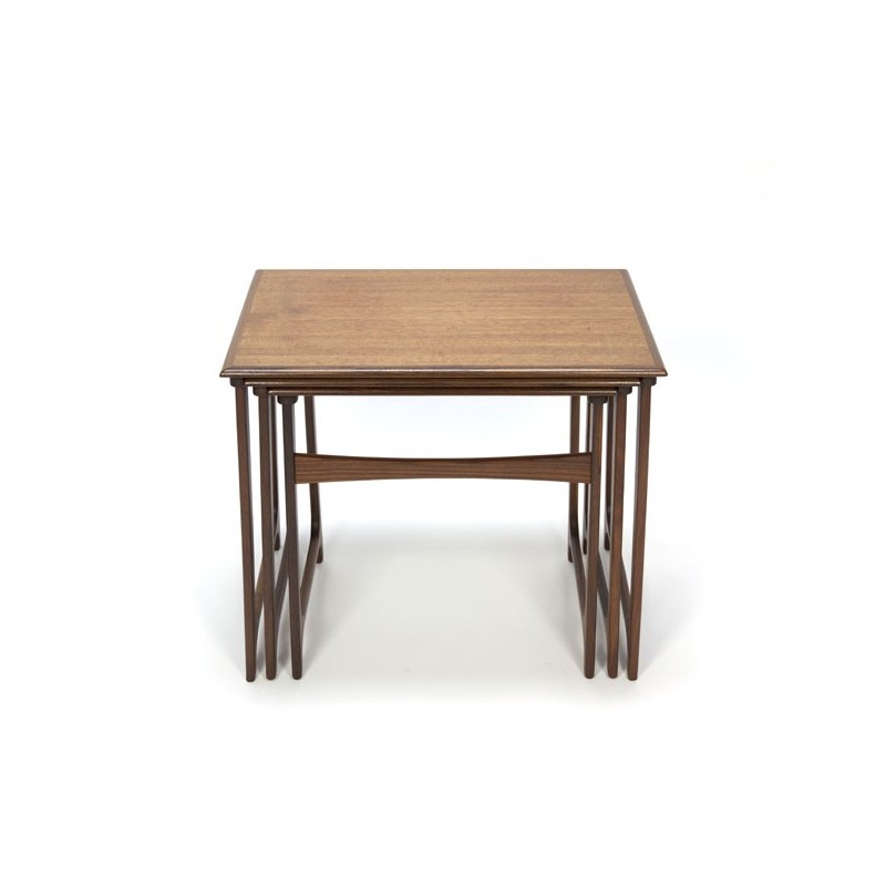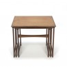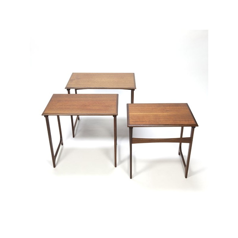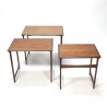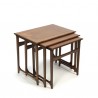 Deense design set van 3 nest tafels. Luxe uitvoering in mooi teakhout en rank design. De tafeltjes kunnen in elkaar geschoven worden waarbij de 2 tafeltjes los van de grond zweven. De conditie is goed, zie ook de detailfoto's. De afmetingen zijn 60,5 cm L/ 38,5 cm D/ 51,5 cm H, de opeenvolgende hoogte is 49,5 cm en 48 cm.