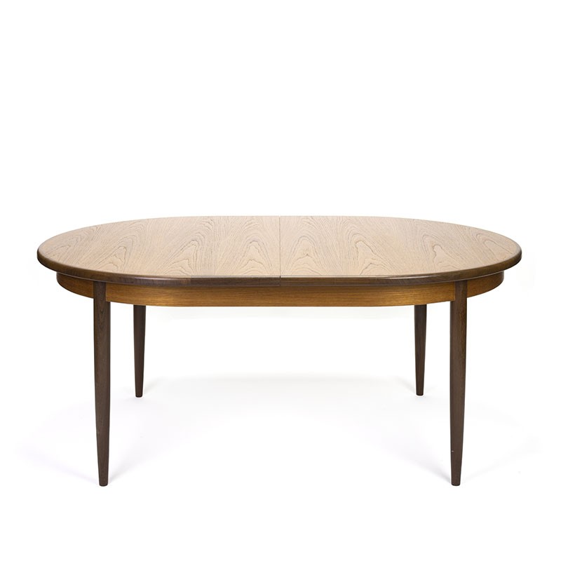 Eettafel uit de zestiger jaren, ovaal model. De vintage tafel is uitgevoerd in teak en heeft een uitschuifbaar tussenblad dat verzonken ligt onder het blad. Grote ruime tafel van het Engelse merk Gplan. De conditie is goed, minimale gebruikssporen, zie details. De afmetingen zijn 162,5-208 cm lang, 112 cm breed en 73 cm hoog.