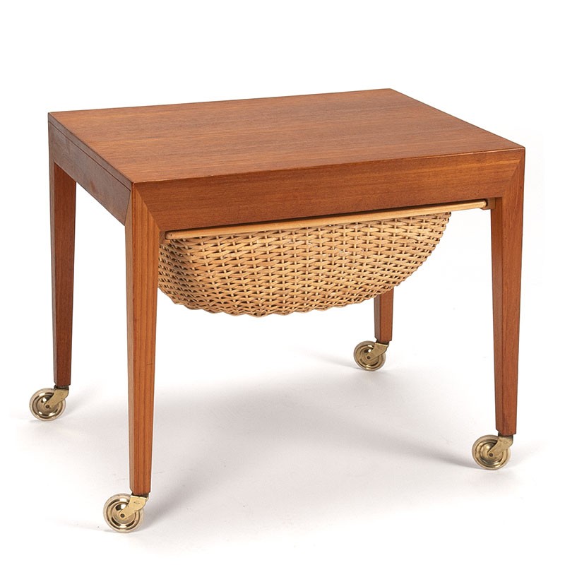 Deens design naaigerei tafeltje, model nummer 40. Ontworpen in de zestiger jaren door Severin Hansen voor Haslev Møbelsnedkeri ( gemerkt). Stijlvol vintage tafeltje ontworpen met de fameuze lijnen in het ontwerp, een handelsmerk van Severin Hansen. De conditie is goed gezien de leeftijd, rieten mand is intact, zie details. De afmetingen zijn 58,5 cm lang, 43,5 cm breed en 52 cm hoog.