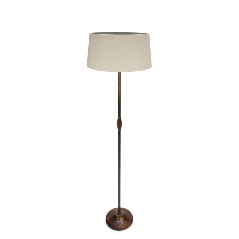 Deense vintage vloerlamp uit de zestiger jaren. Luxe uitvoering met messing en palissander tussenstuk en voet, de lamp heeft een nieuwe kap. De conditie is goed gezien de leeftijd, zie de details. De afmetingen zijn 154,5 cm hoog en 45 cm in diameter.